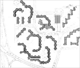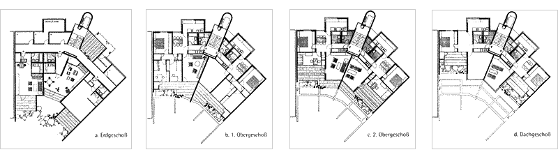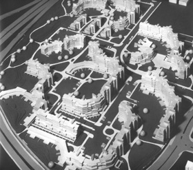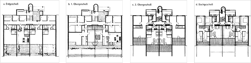 mit denen unsesr Büro beschäftigt war. Wir hatten am Wettbewerb für die Neubebauung von Bonn-Tannenbusch teilgenommen; unser städtebauliches Konzept, in Zusammenarbeit mit der Schmitz KG entwickelt, wurde mit dem ersten Preis ausgezeichnet. Die vorgegebene hohe Verdichtung machte es notwendig, das gesamte Gebiet mit Geschoßwohnungen zu bebauen. Wir versuchten als Ausgleich, die lebendigge soziale Mischung, die sonst durch das Angebot unterschiedlicher Wohnformen in einer Wohnanlage hergestellt wird, innerhalb der Gebäude selbst zu verwirklichen. Das erreichten wir durch geschickte Variation übereinanderliegender Grundrisse bei sich verändernder Bautiefe, wodurch ein vielfältiges Angebot unterschiedlicher Wohnformen und Wohnqualitäten in einem Haus zustande kam. |