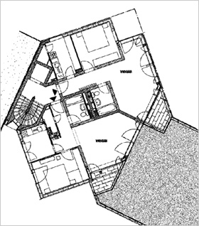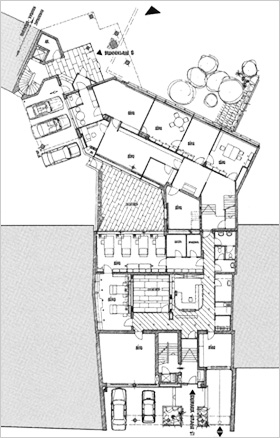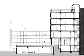 werden zum Teil noch heute von meinen Nachfolgern genutzt. Das Gebäude schließt direkt an den rückwärtigen Flachbau der Bismarckstraße 31 an. Auch die Tiefgarage konnte nach hinten erweitert werden. Zwischen Altbau und Neubebauung entstand ein kleiner Innenhof, von dem aus ein Teil der Büroräume belichtet wird. Eine Skulptur des Bildhauers Heinz Heiber formuliert seinen gestalterischen Mittelpunkt. Die drei Wohngeschosse über dem Bürotrakt bilden einen Kopfbau für die Wohnbebauung entlang der Brunnengasse. Die kleinen, aber geschickt zugeschnittenen 2-Zimmer-Wohnungen sind nach wie vor sehr gefragt. |