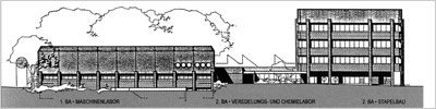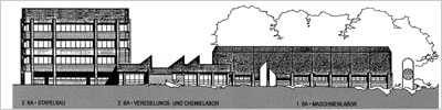 Maschinenhalle (1. Bauabschnitt) und das neue Textillabor (2. Bauabschnitt).