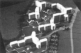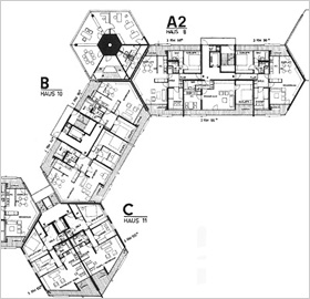 für den Gerling-Konzern. Die Baukörper sind als lange, geknickte Zeilen konzipiert, die sich aus hexagonalen Teilstücken verschiedener Größe zusammensetzen. |