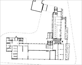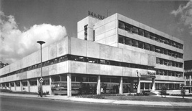 beherbergen. Das Grundstück liegt am Friedrich-Ebert-Platz, der damals ein wichtiger Verkehrsknotenpunkt der Remscheider Innenstadt war; bis heute befindet sich dort der zentrale Busbahnhof. In dieser städtebaulichen Situation ging es darum, ein Gebäude zu entwerfen, das nicht nur den Ansprüchen eines expandierenden Unternehmens genügte, sondern das auch ein unübersehbares Zeichen im Stadtbild setzte, mit dem sich die Firma nach außen darstellte. Wir schlugen ein Konzept vor, das die funktionale Aufteilung der Produktionsabläufe nach außen sichtbar werden ließ. Ein fünfgeschossiger Büroriegel beherbergte Redaktion und Geschäftsführung; in einem damit verbundenen flachen Baukörper war die gesamte Herstellung der Zeitung untergebracht. |