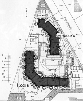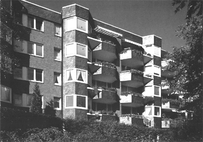 eines Südhangs über der Stadt. Die Anlage besteht aus zwei fünfgeschossigen Wohnzeilen, die so gegeneinander verschoben sind, daß sie einen innenhofähnlichen Raum mit Grünflächen und Spielplatz einschließen. Die beiden Baukörper sind aus aneinander gereihten Zweispännern zusammengesetzt. In den drei oberen Etagen liegen großzügig geschnittene 2-Zimmer-Wohnungen mit einem herrlichen Fernblick. Die ebenerdigen 5-Zimmer-Wohnungen sind Maisonettes über zwei Geschosse; von dem auf der oberen Ebene gelegenem Wohnzimmer kann man über eine außenliegende Wendeltreppe den kleinen Garten erreichen. |