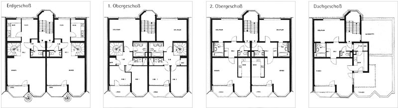 ![]() Grundrisse: (von links) 5-Zimmer-Maisonette-Wohnung, obere Ebene - Maisonette-Wohnung, untere Ebene 2-Zimmer-Wohnung im Obergeschoß - Grundriß Dachgeschoß |
