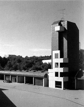 Die Feuerwache war eines meiner Lieblingsbauvor- vorhaben. Als wir zur Wettbewerbsteilnahme aufgefordert wurden, mußten wir uns erst einmal gründlich mit der Problematik auseinandersetzen - noch nie zuvor hatten wir an einem ähnlichen Thema gearbeitet. Der erste Preis freute uns deshalb ganz besonders, bedeutete er doch, daß wir die wesentlichen Aspekte erfaßt und in einer guten Form umgesetzt hatten. In unserem Konzept sind zwei Punkte von besonderer Bedeutung: zum einen liegt die Leitzentrale im Zentrum des Objekts, mit Sichtkontakt zur Einfahrt, zum Hof und zur Fahrzeughalle. Auf diese Weise können die Fahrzeugbewegungen direkt kontrolliert werden und nicht, wie sonst vielerorts, nur über Monitore. Zum anderen bewältigen wir die schwierige Hanglage dadurch, daß wir das Funktionsgebäude an der Vorder- und Rückseite jeweils von verschiedenen Ebenen aus erschlossen. Das ermöglichte eine kompakte Anordnung der geforderten flächenintensiven Nutzungen übereinander. Aber nicht nur die architektonische Arbeit war spannend - viel Freude machte uns die engagierte Mitwirkung der Feuerwehrleute, die immer wieder unser Wissen über ihre Aufgaben bereicherten. |
