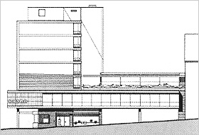 Aufträge in Remscheid und Umgebung. Immer wieder trat sie als Bauherr größerer Wohnanlagen an uns heran und verwirklichte unsere Projekte. Ihr langjähriger Vorstand, Günther Thiel, beauftragte uns auch mit der Planung des Remscheider Firmensitzes der Gesellschaft. Wir entschieden uns, die auf dem Grundstück zulässigen Geschossflächen nicht in Form der ursprünglich vorgesehenen gleichmäßigen Randbebauung zu realisieren, sondern am Drehpunkt zwischen Alle-, Hoch- und Hindenburgstraße einen Akzent zu setzen. So entstand hhier ein siebengeschossiges Gebäude, mit den Verwaltungsräumen der GEWAG in den ersten beiden Etagen und 1-Zimmer-Appartements in den darüberliegenden Stockwerken. Da das Gebäude fast auf der Hügelkuppe steht, hat man von dort aus einen herrlichen Blick über das Bergische Land. |