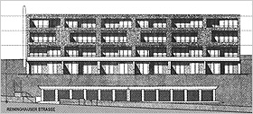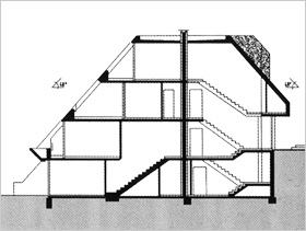 der Stadt zu entwerfen. Wir standen vor zwei Problemen: eine architektonische Form zu findenk, die sich gut in die umliegende, kleinteilige Villenbebauung einfügt, und die starke Hanglage des Grundstücks zu bewältigen. Mit dem Konzept des Terrassenhauses lösten wir beide Probleme. Es kostete jedoch viel Überzeugungsarbeit, den Nachbarn die Richtigkeit unserer Lösung zu veranschaulichen. Die letzten Zweifel wurden erst mit der Fertigstellung des Gebäudes beseitigt. Zur Grotenbachstraße hin ist der Baukörper nur zweigeschossig. Gegliedert durch die plastische Ausformung der Fassade, fügt er sich gut in den kleinteiligen Charakter der Umgebung ein. |