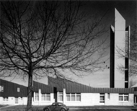 Nachdem wir die Wettbewerbe in Riemke und Stahlhausen gewonnen hatten, erteilte uns das Landeskirchenbauamt Bielefeld für diesen Bau einen Direktauftrag. Wie bei unseren anderen Kirchenbauten versuchten wir auch hier, den verschiedenen funktionalen Elementen ihre eigene Form zu geben und sie zu einem Ensemble zu verbinden. Schwerpunkt der Anlage ist der fünfeckige Kirchenraum mit geneigtem Dach. Er ist innen sehr schlicht und introvertiert gestaltet. Die Wandflächen sind in Kalksandsteinziegeln mit wechselndem Fugenbild ausgeführt, die Decke ist mit Holz verkleidet. Durch Schlitze unter der Decke und einige wenige senkrechte Öffnungen fällt Licht in den Raum. Einen vertikalen Gegenpol zum Saalbau bildet der schlanke Turm, in dessen Glockenstuhl die alten Glocken der 1965 abgebrochenen "Ümminger Kirche" läutern. Er steht inmitten eines flachen Foyers, von dem aus die Gemeinderäume erschlossen werden. 1986 ergänzten wir diesen Gebäudeteil durch einen Vorbau mit zusätzlichen Versammlungsräumen und einer Küsterwohnung. |