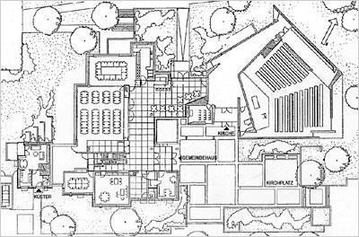 ![]() Grundriß mit den Ergänzungsbauten von 1986. Vom Eingang in der Mitte des Ensembles geht man erst einmal um den Kirchenraum herum, um ihn dann von der Rückseite her zu betreten. |