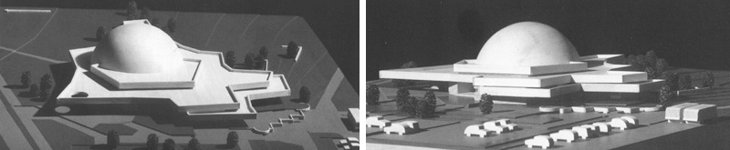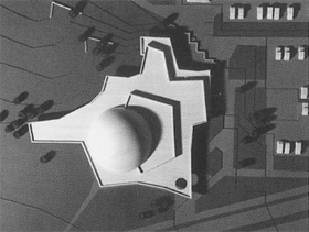 beauftragt, einen Entwurf zu erarbeiten. In einem Planetarium wird der Sternenhimmel von einem Spezialprojektor auf die Innenseite einer Kuppel pojiziert. Wir versuchten, diese Kuppel auch von außen zum prägenden Merkmal des Gebäudes zu machen und die notwendigen Nebenräume in einer flachen Basis anzuordnen. Das Projekt scheiterte zunächst an Finanzierungsschwierigkeiten. Später veranstaltete die Hochdahl - Entwicklungsgesellschaft einen Wettbewerb für ein Bürgerzentrum, in dessen Raumprogramm auch ein Planetarium vorgesehen wurde. Beim letztendlich realisierten Bau wird jedoch darauf verzichtet, diese Nutzung auch zeichenhaft erkennbar zu machen. |