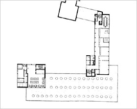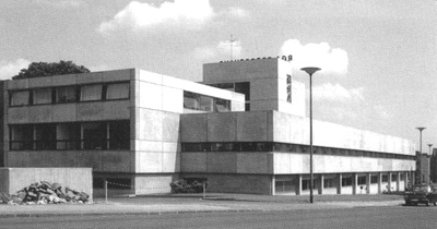 beherbergen. Das Grundstück liegt am Friedrich-Ebert-Platz, der damals ein wichtiger Verkehrsknotenpunkt der Remscheider Innenstadt war; bis heute befindet sich dort der zentrale Busbahnhof. In dieser städtebaulichen Situation ging es darum, ein Gebäude zu entwerfen, das nicht nur den Ansprüchen eines expandierenden Unternehmens genügte, sondern das auch ein unübersehbares Zeichen im Stadtbild setzte, mit dem sich die Firma nach außen darstellte. Wir schlugen ein Konzept vor, das die funktionale Aufteilung der Produktionsabläufe nach außen sichtbar werden ließ. Ein fünfgeschossiger Büroriegel beherbergte Redaktion und Geschäftsführung; in einem damit verbundenen flachen Baukörper war die gesamte Herstellung der Zeitung untergebracht. |