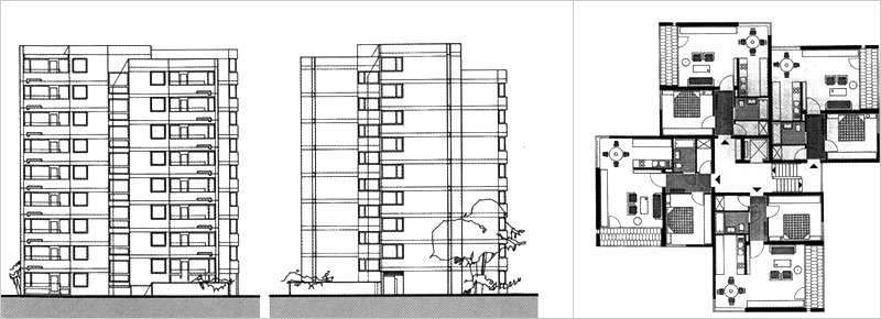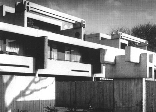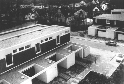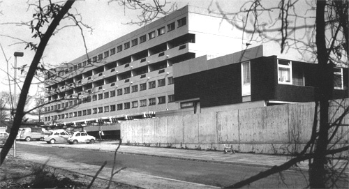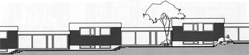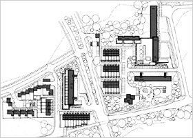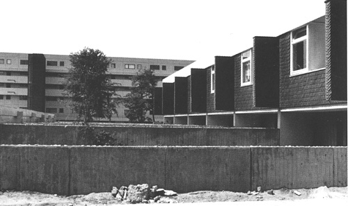 auf und beauftragte uns mit Planung und Ausführung. Auch bei dieser Anlage arbeiteten wir mit einer Mischung verschiedener Wohnformen: Einfamilienhäuser in verdichteter Bauweise, Reiheneigenheime, Eigentums- und Mietwohnungen. Die Mietwohnungen sind in vier Wohnzeilen und einem Punkthaus untergebracht. Für die Eigentumswohnungen entwickelten wir eine sechsgeschossigen Riegel mit jeweils drei übereinander liegenden Maisonette-Wohnungen, die von der Rückseite aus über Laubengänge erschlossen werden. Der Bau steht leicht erhöht auf einer Tiefgarage, so daß die Wohnungen im Erdgeschoß und die dazu gehörenden Gartenflächen auf dem Garagendach nicht eingesehen werden können. Auch für die Reihenhäuser und die Eigenheime entwickelten wir teilweise völlig neue Haustypen. |