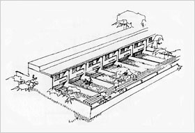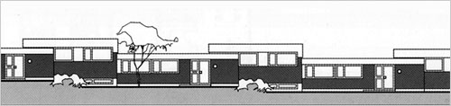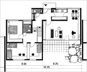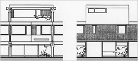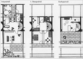 | Das Erdgeschoß hat einen leichten Höhenversatz, so daß die Keller natürlich belichtet werden können und die Gesamtabwicklung in der Länge plastischer wird. | |||