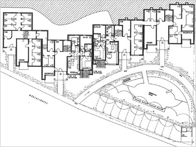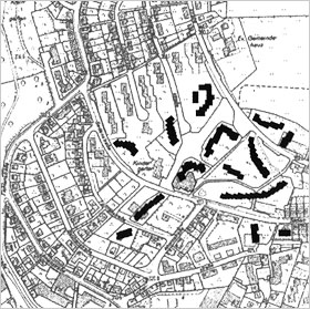 Wohnungsgenossenschaft Remscheid (GWG) dort einstellen wollte. Unser Konzept sah vor, an der höchsten Stelle des Grundstücks ein 12-geschossiges Hochhaus zu errichten. Daran schloß sich eine Bebauung aus 4- bis 5-geschossigen Wohnzeilen an, die sich, dem Gelände folgend, mit großzügigen begrünten Zwischenräumen über den abschüssigen Hang gruppierten. In den achtziger Jahren konnte ich einige der angrenzenden Grundstücke erwerben und schrittweise auf eigene Rechnung mit Mehrfamilienhäusern bebauen, wobei ich die beim ersten Projekt begonnene Struktur weiterführte: Zeilenbauten, die über das hangige Gelände gestaffelt sind, umgeben von begrünten Freiräumen. Auch die Eigentümer benachbarter Grundstücke, die Thyssen Wohnungsbaugesellschaft Oberhausen und die GWG Remscheid, beauftragten uns mit Planungen ähnlicher Art. So ist über mehr als zwei Jahrzehnte an diesem Ort ein Ensemble von Wohnbauten entstanden, das eine gestalterische Kontinuität besitzt und hohe Wohnqualität bietet. |