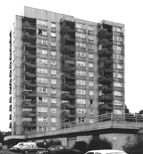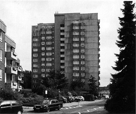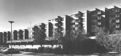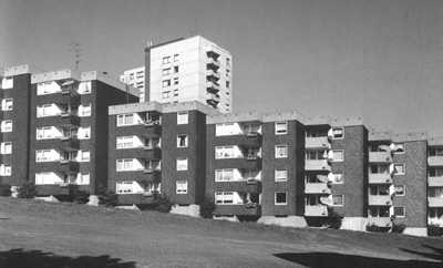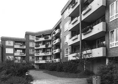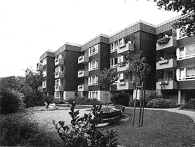 ![]() Blick auf die Wohnanlage der GWG. Im Hintergrund das Hochhaus (Aufnahme kurz nach der Fertigstellung) (Foto: H. Grempel) |