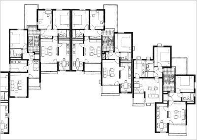 ![]() Geschoßgrundriß: Der Baukörper besteht aus aneinandergereihten Zweispänern mit 2- oder 3-Zi-Wohnungen. |