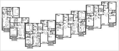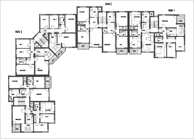 ![]() Block B, Grundrißausschnitt Der Grundriß besteht aus einer gestaffelten Reihung von Zweispännern. |