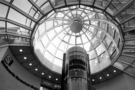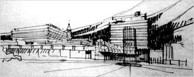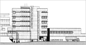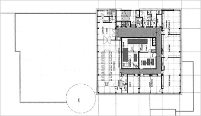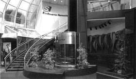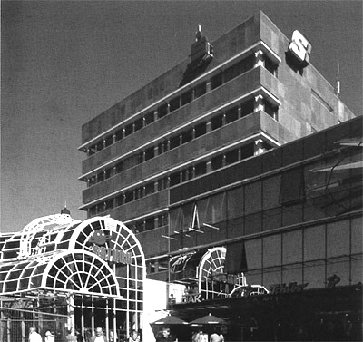hätte man die Ladenpassage nicht am Rand des Platzes entlang führen können. Mit dem Bau des Centers mußte also auch der Hauptsitz der Stadtwerke neu errichtet werden. Wir integrierten den Neubau in den Gesamtkomplex, mit einem Kundenzugang vom Allee-Center aus. Ein Kubus mit Bürogeschossen ragt über das Center hinaus. Dieser Kubus nimmt in seiner Höhe, seiner Fassadeneinteilung und seinem Oberflächenmaterial den Bezug zum Baukörper der Sparkasse auf und wirkt wie ihr kleineres Pendant. Von der Alleestraße gesehen umrahmen die beiden Bauten als Ensemble den Eingangsbereich der Ladenpassage. Zur östlich anschließenden Bebauung vermittelt ein dreigeschossiger Gebäudeteil mit Silent-Gliss-Fassade. |
