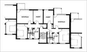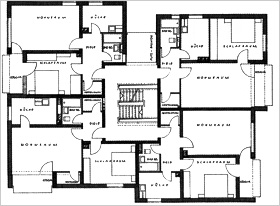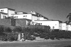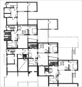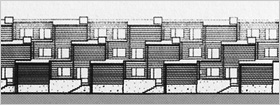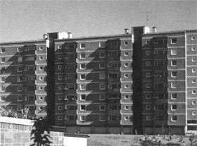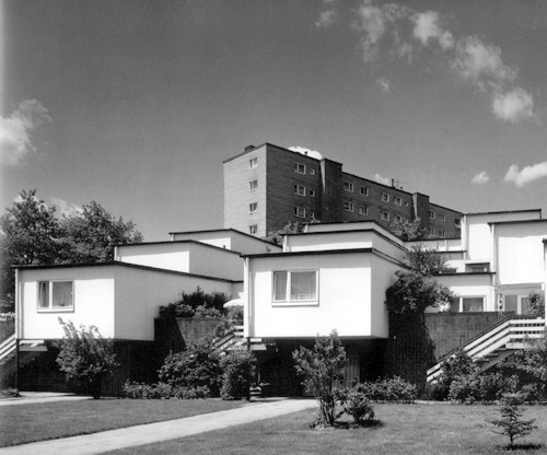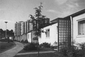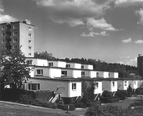 GEWAG den ersten großen städtebaulichen Wettbewerb in Remscheid. Unser Beitrag wurde zwar "nur" mit dem 2. Preis ausgezeichnet, aber wir durften in Zusammenarbeit mit dem Gewinner des 1. Preises, Prof. Walter Köngeter, die Weiterbearbeitung und Realisierung durchführen. Prof. Köngeter, der an der Kunsthochschule in Düsseldorf unterrichtete, hat mich nicht nur fachlich, sondern auch menschlich tief beeindruckt. Seine Ideen und Ansichten haben mich in meiner späteren Arbeit immer beeinflußt. Die Anlage Vöpelswiese-Mixsiepen ist eine Mischung aus Zeilenbauten und Terrassenhäusern, die als Eigenheime angeboten wurden. Drei achtstöckige Wohnscheiben bilden den Kern der Anlage, die Terrassenhäuser folgen dem abfallenden Gelände und breiten sich teppichartig in die Landschaft aus. |