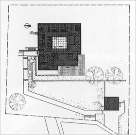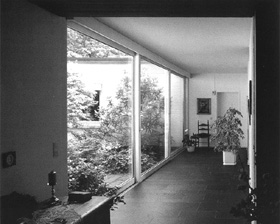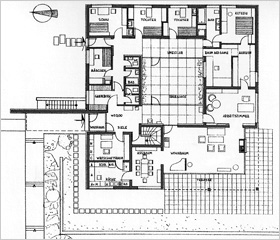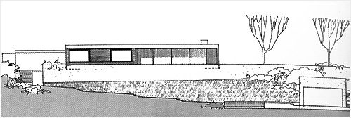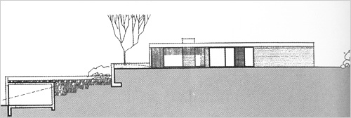 Verlags J.F. Ziegler, beauftragte uns ebenfalls mit dem Bau seines Privathauses. Das große Grundstück liegt sehr reizvoll am Ende einer Stichstraße unmittelbar am Waldrand. Herr Ziegler wünschte sich ein helles, modernes, weiträumiges Haus mit viel Kontakt zum Garten und zur umgebenen Natur. Wir konzipierten einen flachen, ausgedehnten Baukörper mit einem Atrium in der Mitte. Jeder Flügel des Hauses hat seine eigene Nutzung: Im Norden liegen die Wirtschaftsräume, der Ostflügel ist für die Kinder vorgesehen, im Westflügel befindet sich der Wohnbereich, im Süden liegen die Privaträume der Eltern. Der Ostteil kann bei Bedarf als Einliegerwohnung genutzt werden. Der Wohnraum mit offenem Kamin ist zum Garten hin vollständig verglast und setzt sich so über die Terrasse in die Natur fort. Die großzügige Rasenfläche, die sich daran anschließt, ist eben anterrassiert, was sie noch weiträumiger wirken lässt. Gleichzeitig liegt sie dadurch über dem Niveau der Straße und kann von dort aus nicht eingesehen werden. |